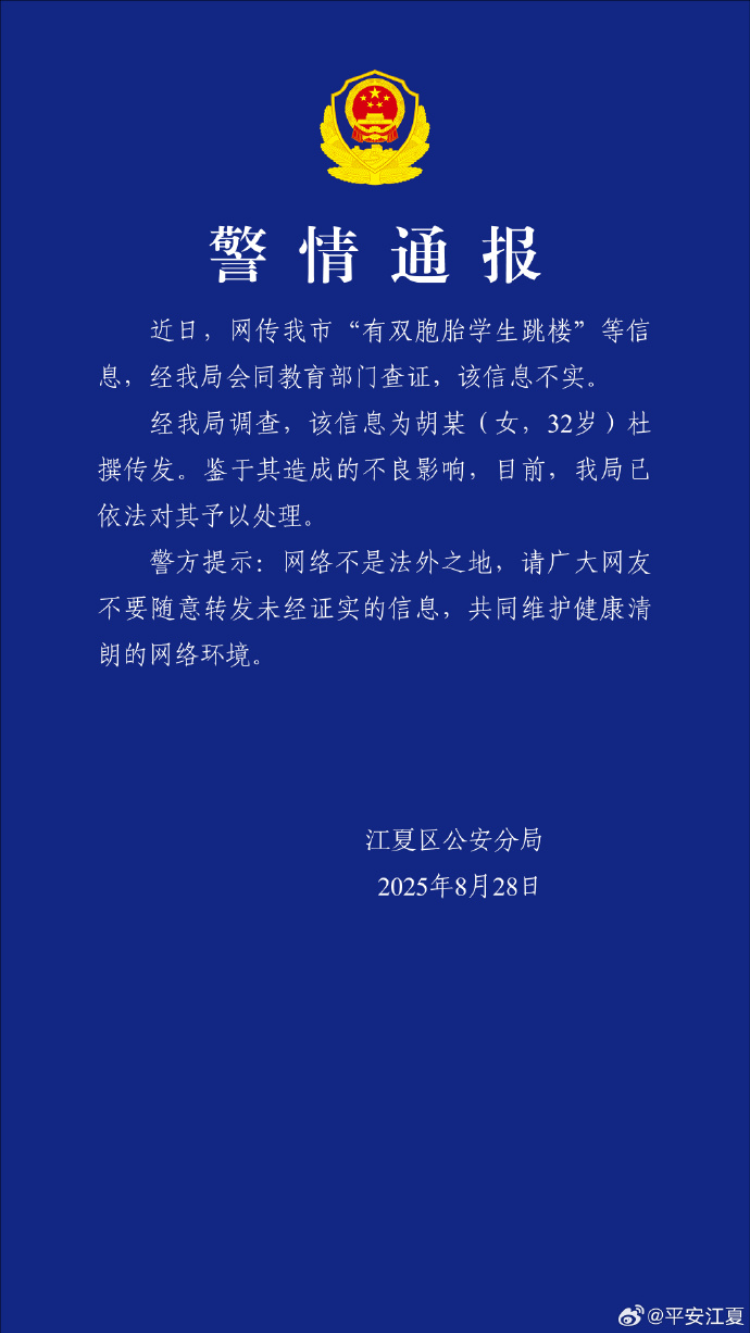 智投期权配资 武汉警方辟谣“双胞胎学生跳楼”:为32岁女子杜撰,已依法处理